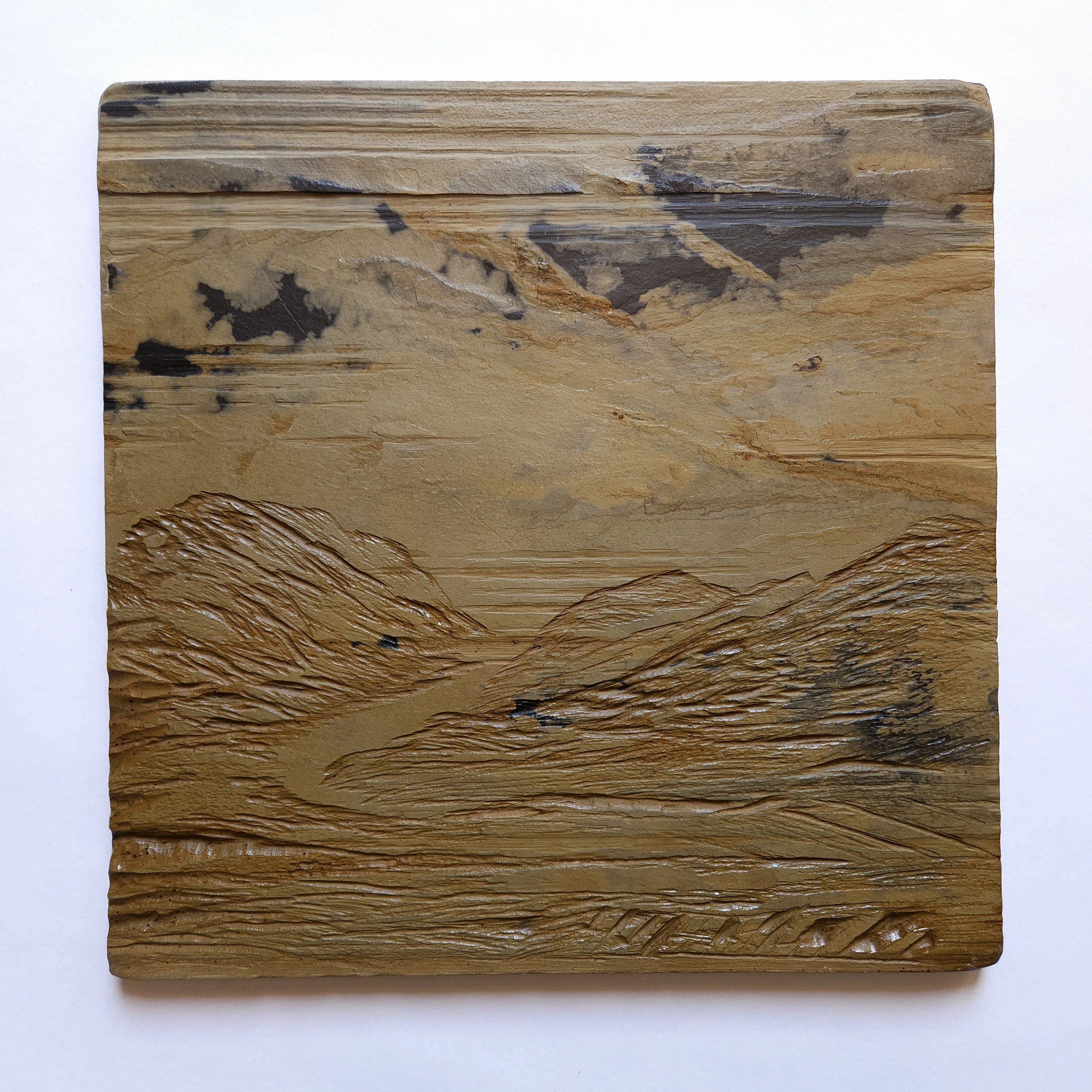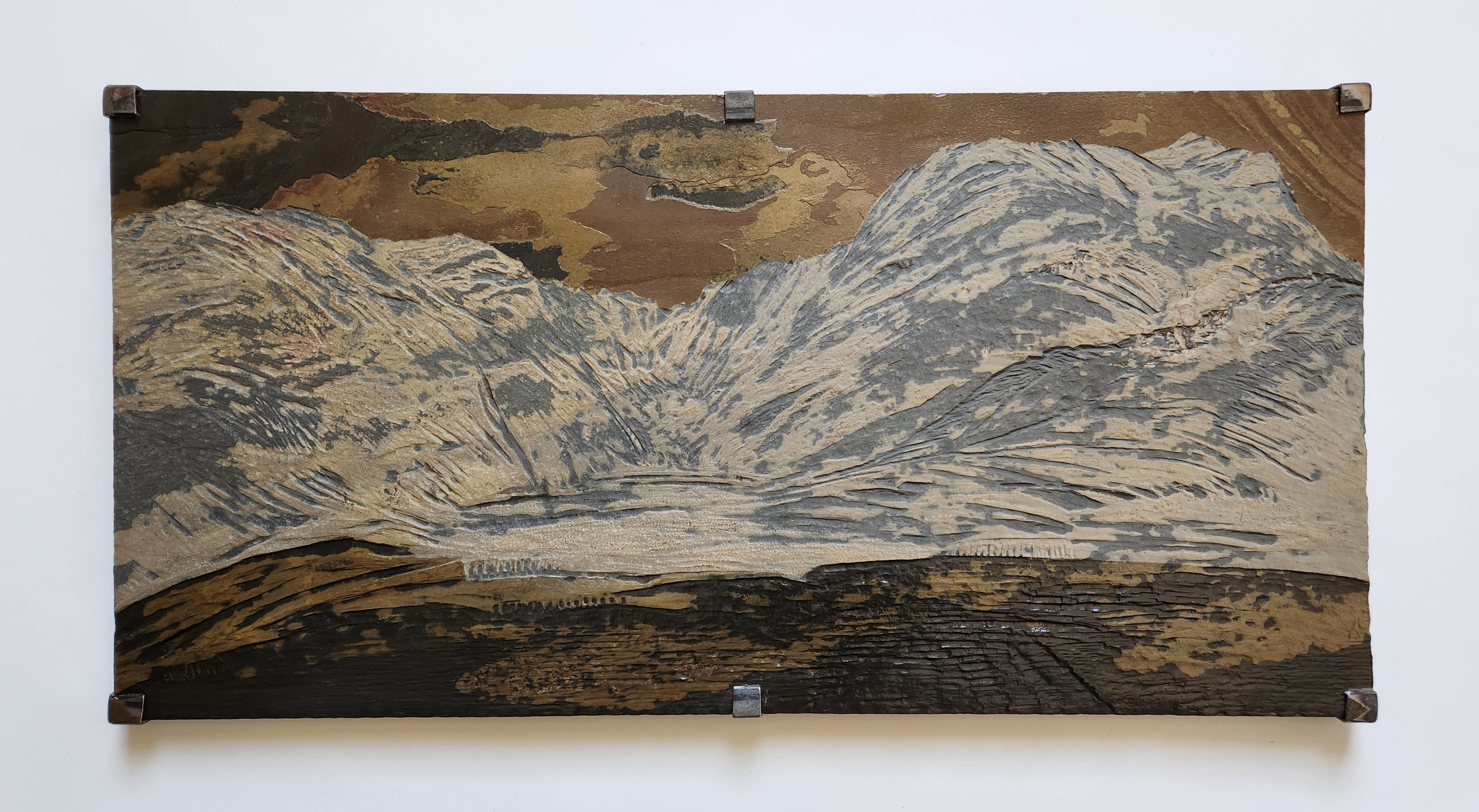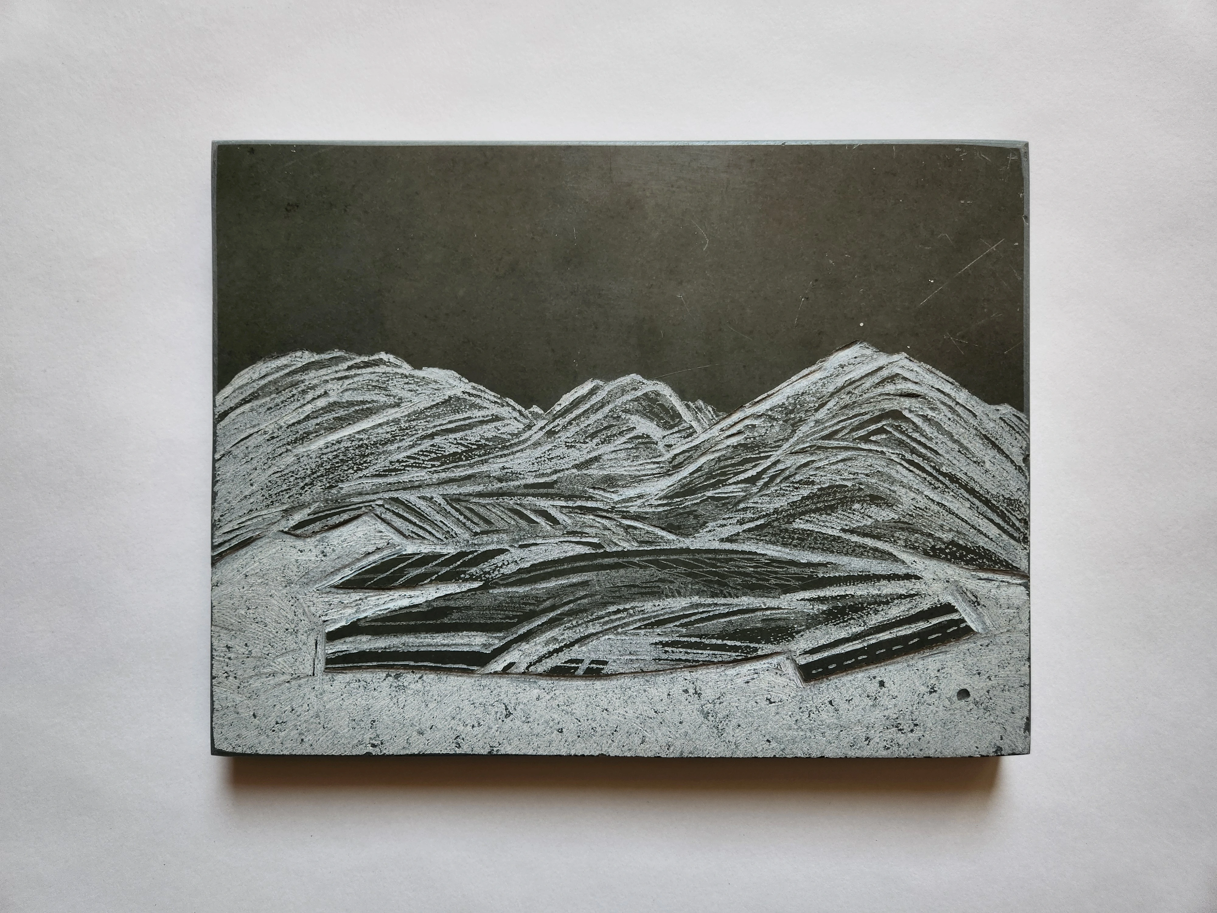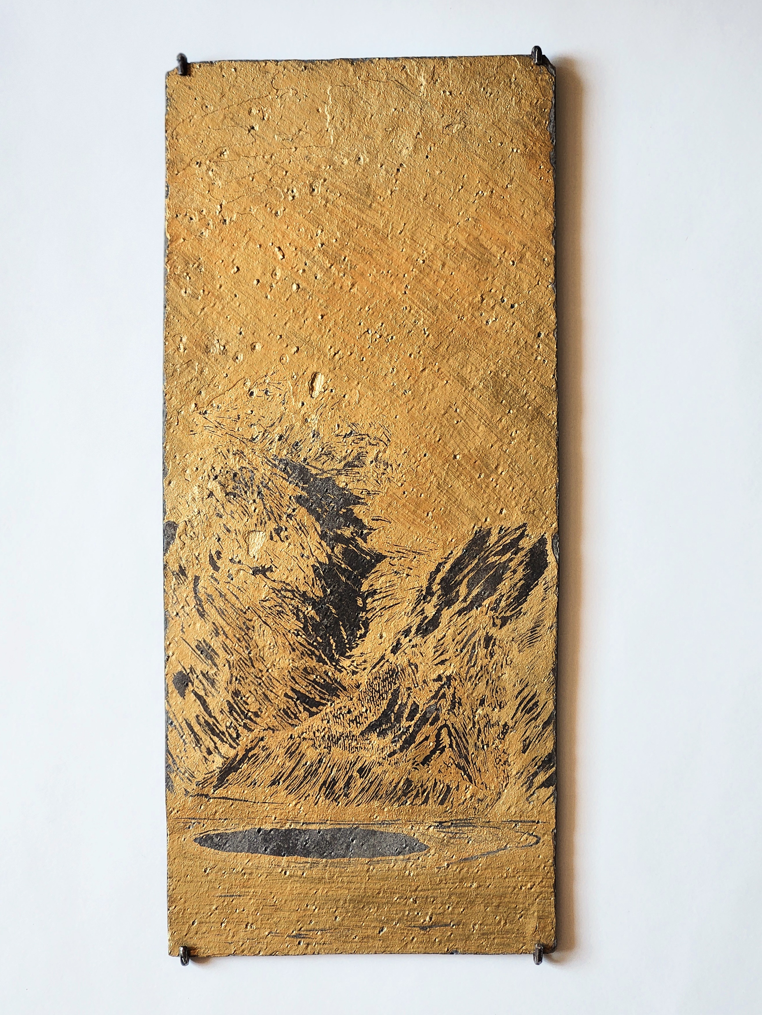 mountains, moraines and mutations, 18” x 16”, ink on himalayan slate, 2025