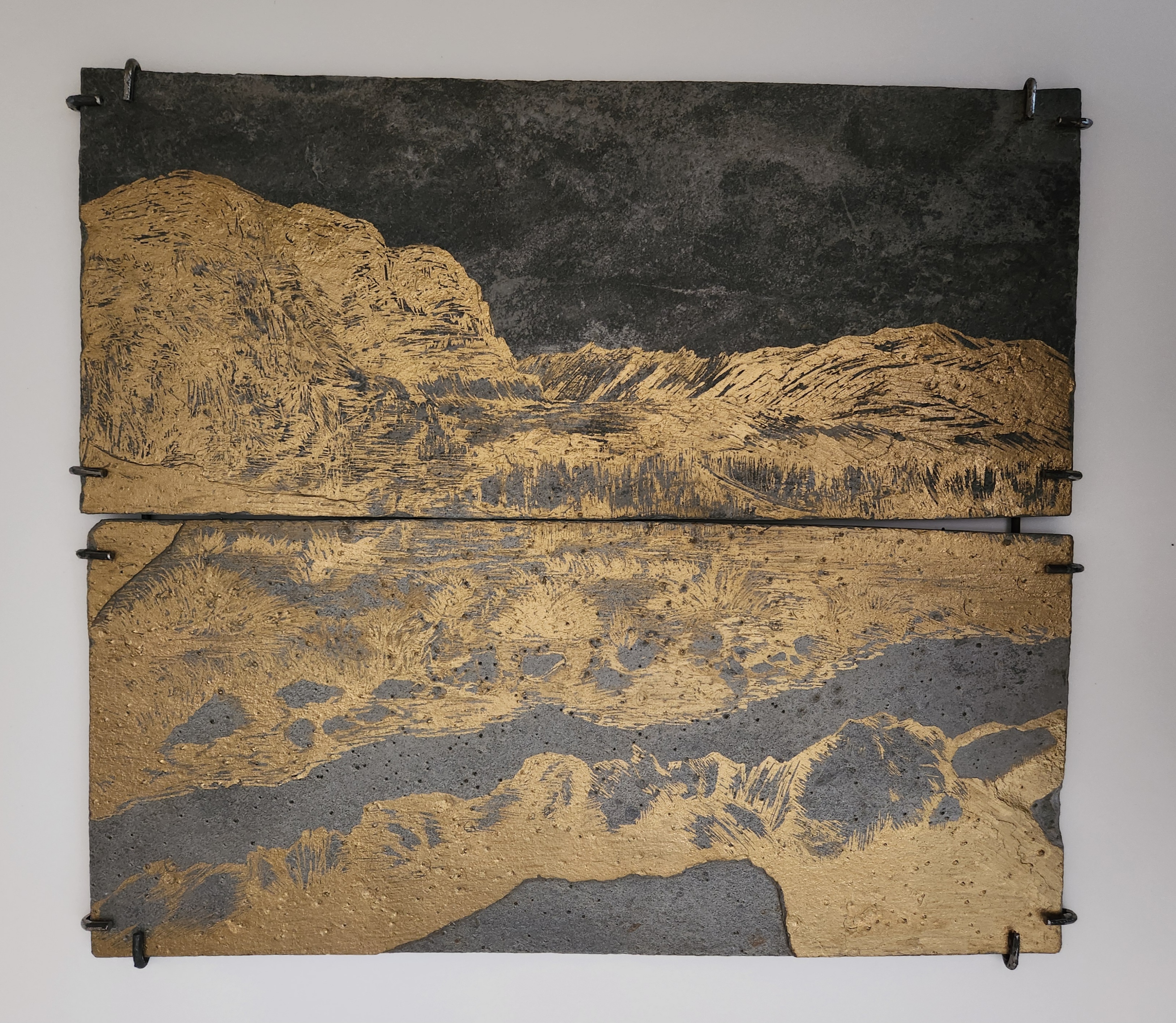 split by split, 9” x 18”, himalayan slate and resin, 2025